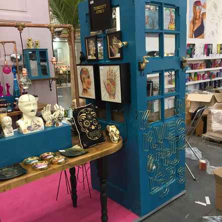 The brief was to create a bespoke trade fair stand to show case a new company's eclectic and quirky range of homewares and gifts, to a trade only customer base. Using vintage finds to display, and one off wall coverings, the design concept was one that could be modified and tailored to suit the changing seasons and product ranges; The stand was erected at various trade shows in the UK, France and Germany.